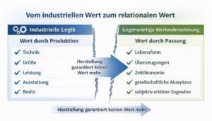 Die Autoindustrie optimiert ihre Produkte nach Maßstäben, die sich bei den Käufern bereits verschoben haben. Die Krise ist aus diesem Grund weniger eine Absatzkrise, als vielmehr eine Krise des Wertverständnisses. Herstellung und Wert fallen nicht mehr automatisch zusammen. Schwindet diese Plausibilität, verliert selbst ein technisch perfektes Produkt, wie ein deutsches Auto, seine Überzeugungskraft.